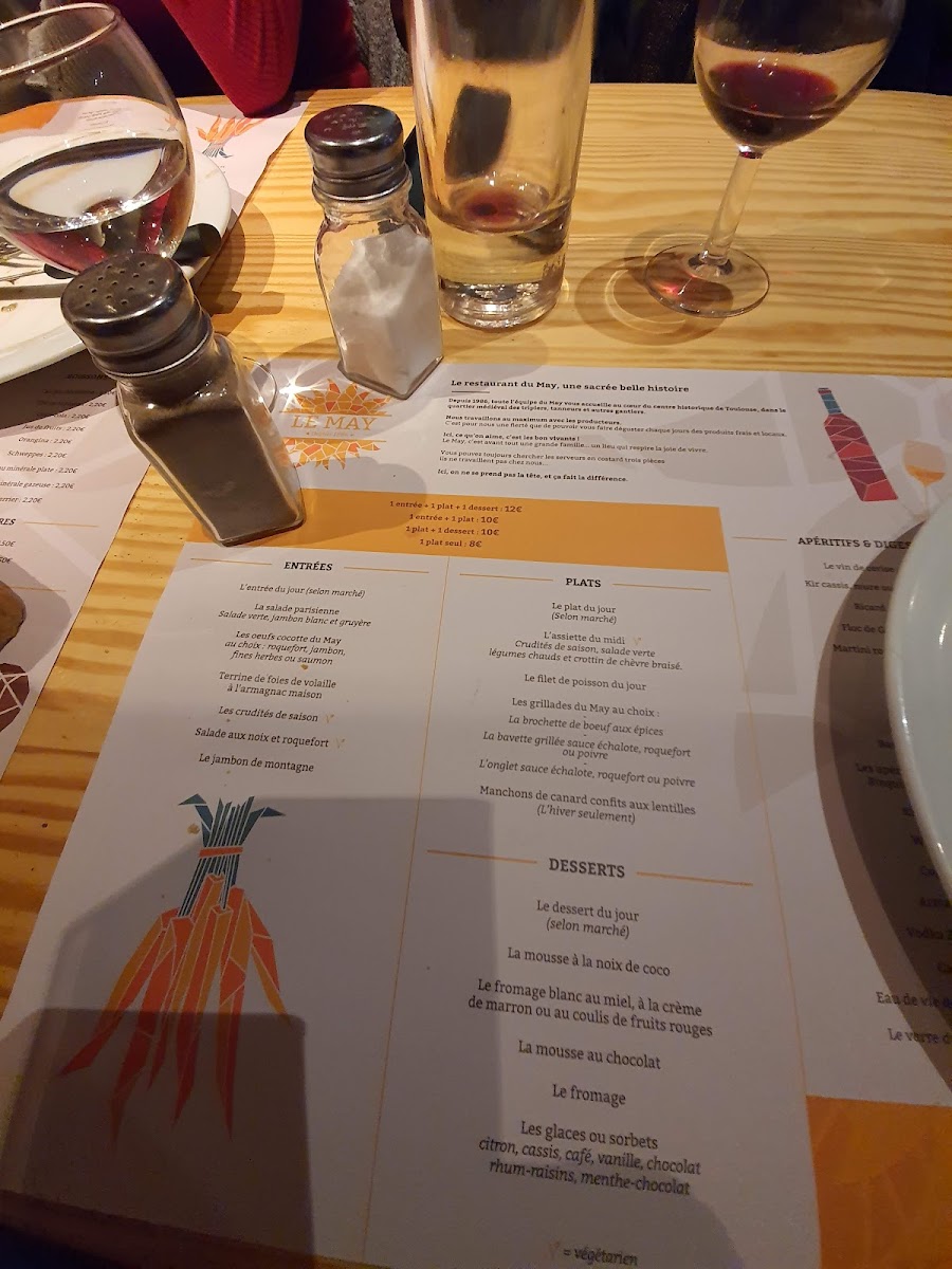 Absolutely top shelf for Cozy, French, and Affordable. We found the restaurant by chance and walked into the only open table in the corner. The place was packed with happy diners rubbing elbows with neighbours. I think you can count on any menu item labelled "du jour." We chose fish (filet de julienne) with an astonishing Tomato/ fresh Mozzarella salad. Wine choice was liberal. "Vin du Moment" was a Côtes du Rhône, affordable by glass or bottle. Of all the French dining this month, Le Mai was our most enjoyed.