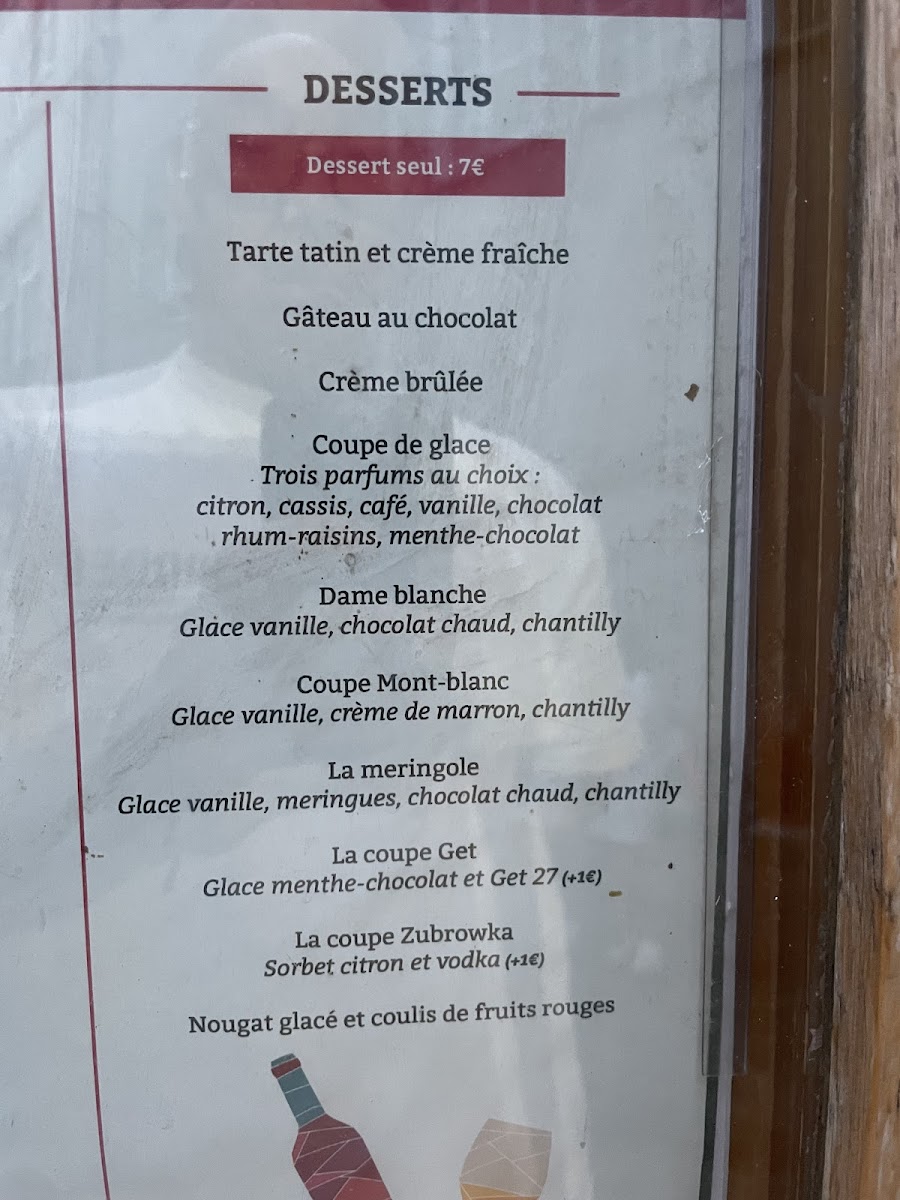 Guests can enjoy rich, savory options such as slow-cooked beef stews and dishes infused with Armagnac, like pâté de foie de volaille or fowl liver preparations. The menu also includes lighter choices, such as marinated anchovies or a simple vegetarian plate, suited to those seeking balance or variety. For dessert, timeless treats like crème brûlée or mousse au chocolat provide a smooth, satisfying finish to the meal.